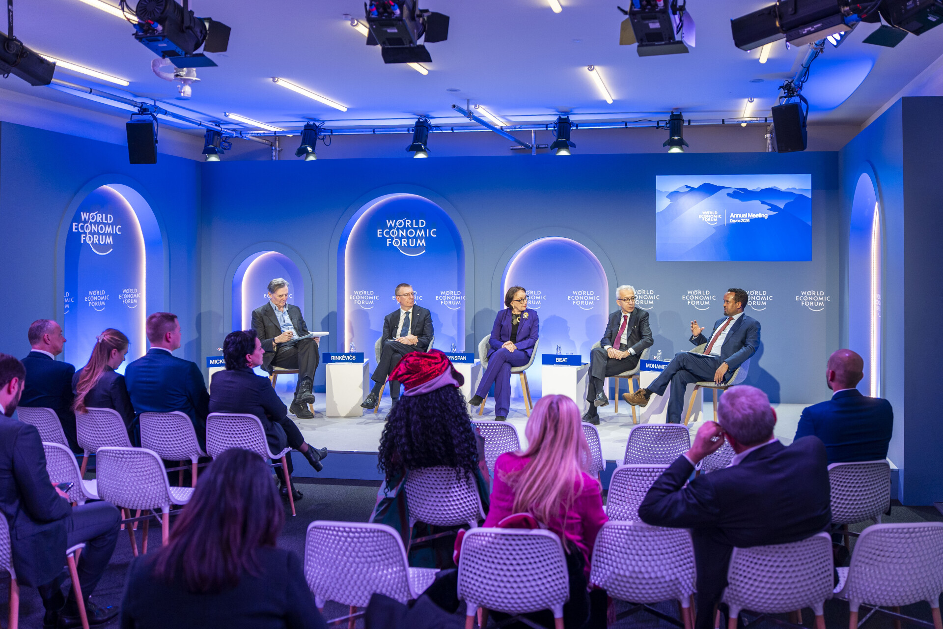 | ImageDescription | Economies Beyond the Shock Cycle session with Faisal Alibrahim, Minister of Economy and Planning of Saudi Arabia; John Micklethwait, Editor-in-Chief, Bloomberg, USA; Marta Kos, Commissioner for Enlargement, European Commission; Mian Muhammad Shehbaz Sharif, Prime Minister of Pakistan; Nawaf Salam, President of the Council of Ministers of Lebanon; at the World Economic Forum Annual Meeting 2026 in Davos-Klosters, Switzerland, on 21/1/2026 from 16:45 to 17:30 in the Congress Centre – Spotlight (Zone B), Stakeholder Dialogue. (economic resilience). Copyright: World Economic Forum/Valeriano Di Domenico |